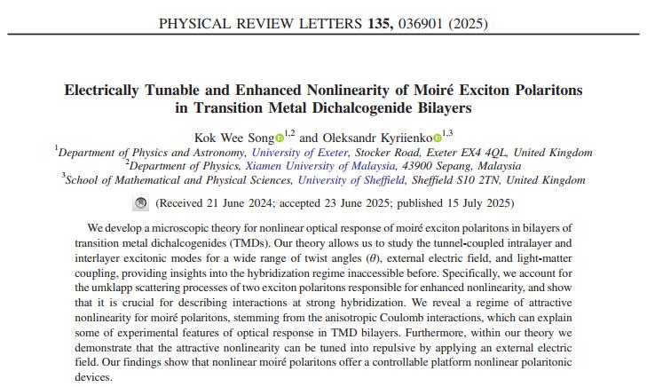 The article, titled “Electrically Tunable and Enhanced Nonlinearity of Moiré Exciton Polaritons in Transition Metal Dichalcogenide Bilayers”, presents a new microscopic theory revealing how light–matter interactions in twisted two-dimensional materials can be significantly enhanced and electrically controlled.