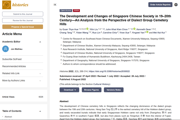 The Development and Changes of Singapore Chinese Society in 19–20th Century—An Analysis from the Perspective of Dialect Group Cemetery Hills (19-20世纪新加坡华人社会发展与变迁——以方言群坟山为视角分析), in Histories, 2022, 2 (3), 288; MDPI, Basel, Switzerland; https://doi.org/10.3390/histories2030022