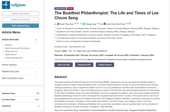 The Buddhist Philanthropist: The Life and Times of Lee Choon Seng (佛教的事业:李俊承的时代与一生), in Religions, 2022, 13(2), 147; MDPI, Basel, Switzerland; https://doi.org/10.3390/rel13020147