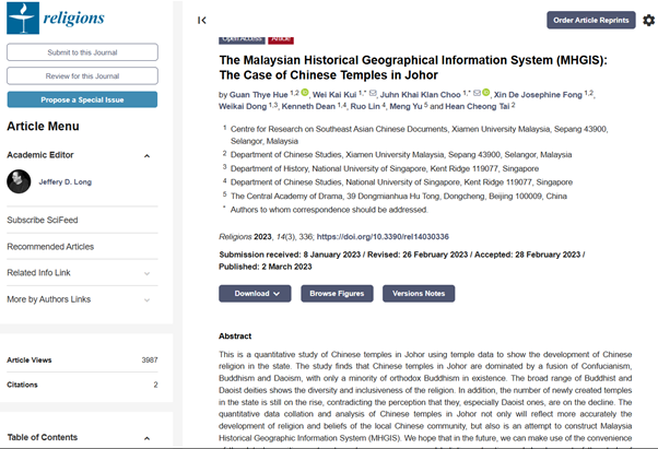 The Malaysian Historical Geographical Information System (MHGIS): The Case of Chinese Temples in Johor (马来西亚历史地理信息系统:以柔佛庙宇为例), in Religions 2023, 14(3), 336; https://doi.org/10.3390/rel14030336