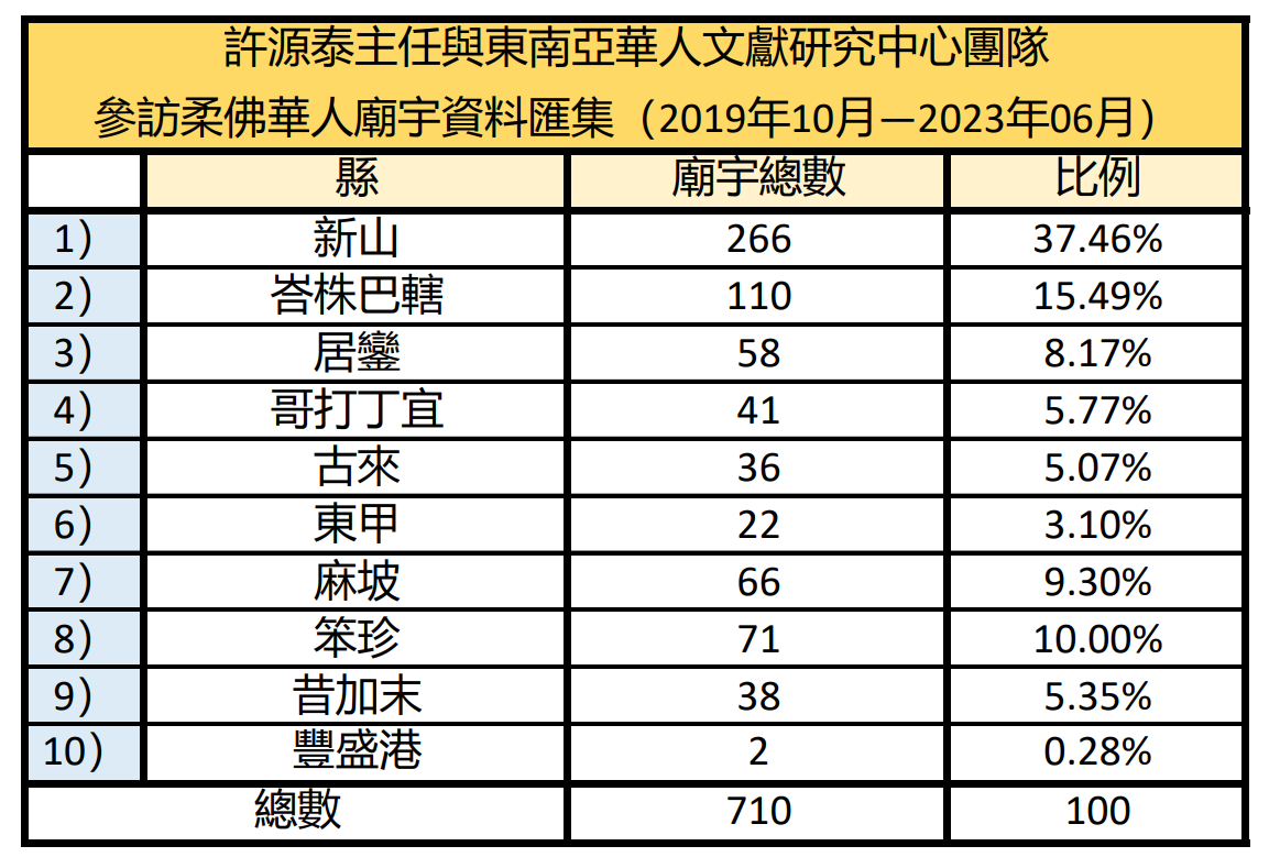 This is a quantitative study of Chinese temples in Johor using temple data to show the development of Chinese religion in the state. The study finds that Chinese temples in Johor are dominated by a fusion of Confucianism, Buddhism and Daoism, with only a minority of orthodox Buddhism in existence. The broad range of Buddhist and Daoist deities shows the diversity and inclusiveness of the religion. In addition, the number of newly created temples in the state is still on the rise, contradicting the perception that they, especially Daoist ones, are on the decline. The quantitative data collation and analysis of Chinese temples in Johor not only will reflect more accurately the development of religion and beliefs of the local Chinese community, but also is an attempt to construct Malaysia Historical Geographic Information System (MHGIS). We hope that in the future, we can make use of the convenience of the data humanities system to make a more macro and holistic exploration and development of the study of Chinese temples and beliefs in Malaysia.