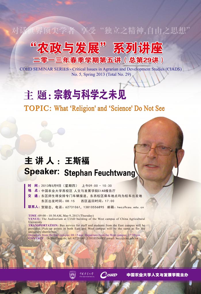 | 9:00–10:30 | 主 题:宗教与科学之未见 Topic: What ‘Religion’ and ‘Science’ Do Not See 主讲人:王斯福,英国伦敦政治经济学院人类学系教授 Speaker: Stephan Feuchtwang, Professor of Anthropology, London School of Economics and Political Science, UK |