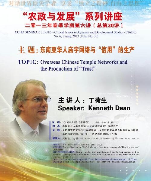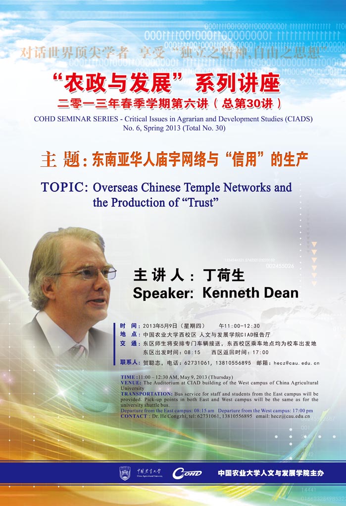 | 11:00–12:30 | 主 题:东南亚华人庙宇网络与“信用”的生产 Topic: Southeast Asian Chinese Temple Networks and the Production of “Trust” 主讲人:丁荷生,加拿大麦吉尔大学东亚系詹姆斯·C. 麦吉尔教授,中国文化研究主席 Speaker: Kenneth Dean, James C. McGill Professor, Chair of Chinese Cultural Studies, Department of East Asian Studies, McGill University, Canada |