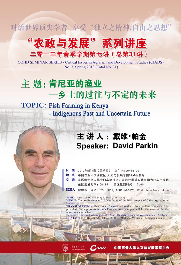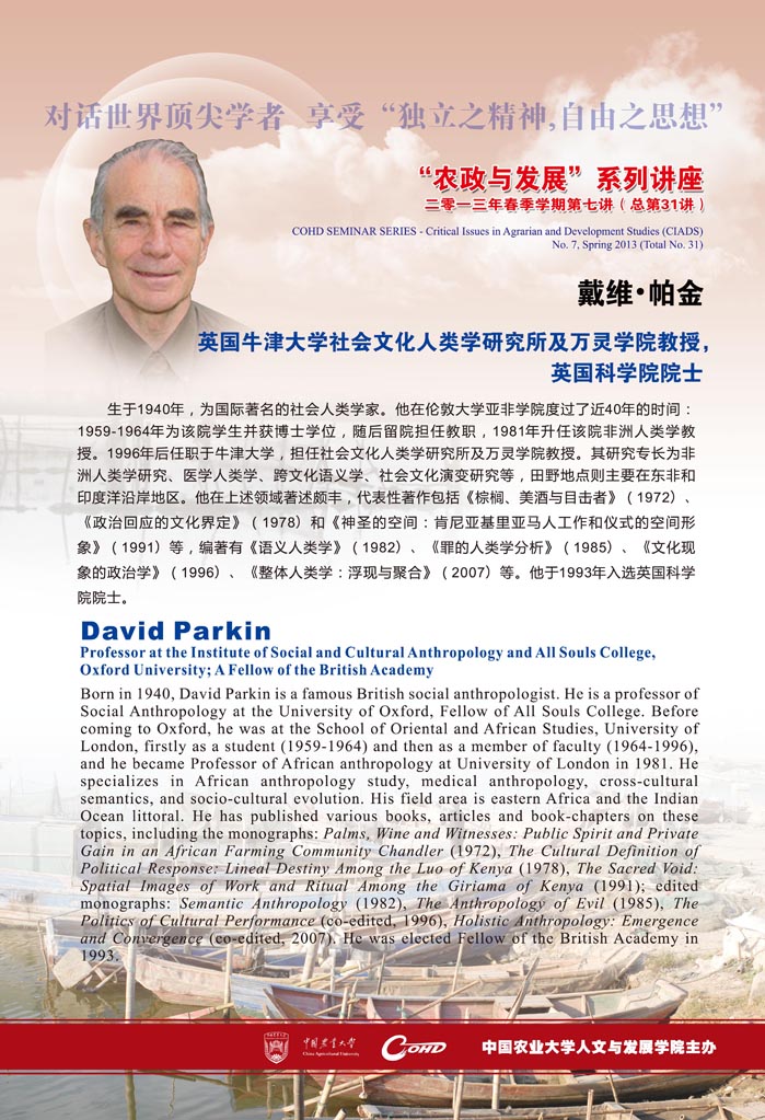 | 14:00–16:00 | 主 题:肯尼亚的渔业——乡土的过往与不定的未来 Topic: Fish Farming in Kenya: Indigenous Past and Uncertain Future 主讲人:戴维·帕金,英国牛津大学社会文化人类学研究所与万灵学院教授,英国科学院院士 Speaker: David Parkin, Professor, Institute of Social and Cultural Anthropology and All Souls College, University of Oxford, UK; Fellow of the British Academy |