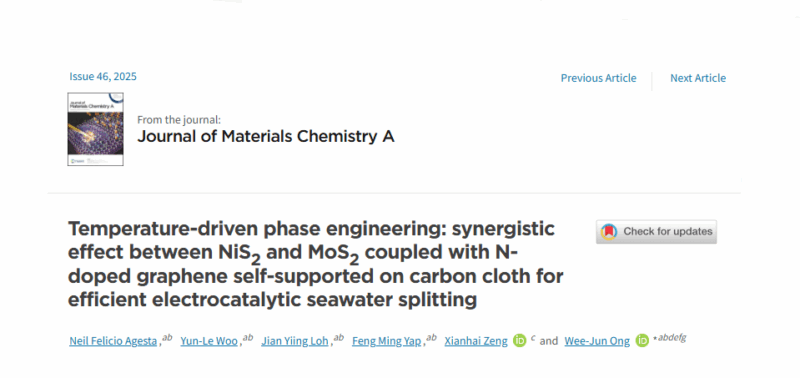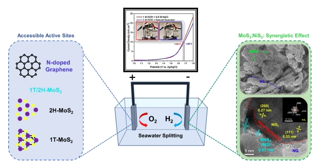 The research article, titled “Temperature Driven Phase Engineering: Synergistic Between NiS2 and MoS2 Coupled with N-Doped Graphene Self-supported on Carbon Cloth for Efficient Electrocatalytic Seawater Splitting“, presents a method to engineer a NiS2-MoS2 (MSNS) electrocatalyst for overall seawater splitting, encapsulating hydrogen generation (HER) and oxygen evolution (OER) under ambient conditions, contributing to clean and renewable fuel production.