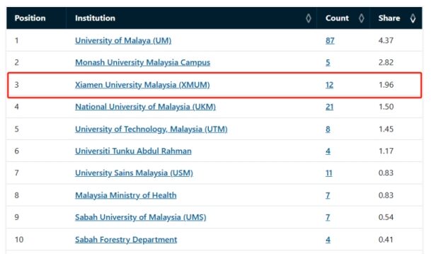 Xiamen University Malaysia Placed 3rd in Malaysia Based on Nature Index Ranking